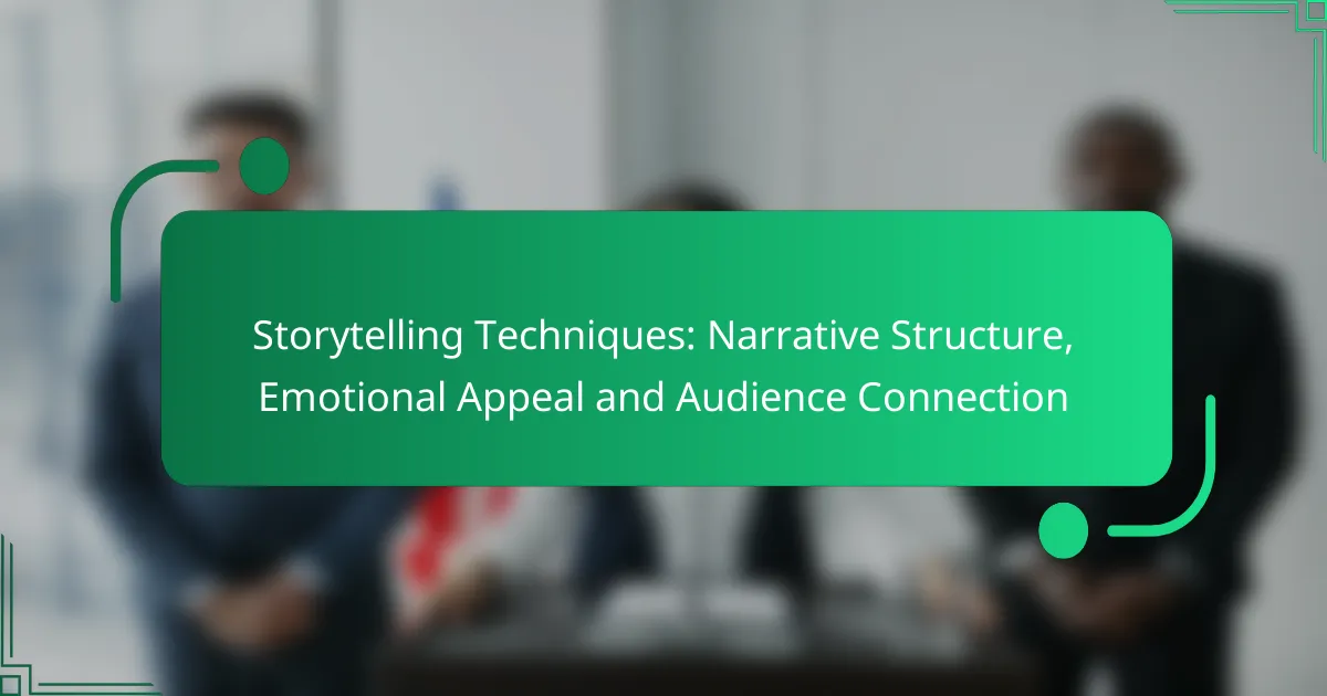 Effective storytelling techniques that enhance audience connection include emotional appeal, narrative structure, character development, visual storytelling, and relatable themes. These elements work together to engage the audience, making the story memorable and impactful.